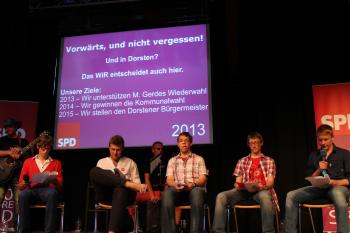 Zuvor hatten die Jusos die Besucher auf eine Zeitreise mitgenommen. Diese begann am 23. Mai 1863, damals gründete sich in Leipzig der Allgemeine Deutsche Arbeiterverein (ADAV). 1869 gründete sich in Eisenach die Sozialdemokratische Arbeiterpartei (SDAP); ADAV und SDAP vereinigten sich 1875 in Gotha zur Sozialistischen Arbeiterpartei (SAP). Die SAP wurde 1878 von der Reichsregierung verboten („Sozialistengesetz“), nach dem Fall des Sozialistengesetzes entstand 1890 die heutige Sozialdemokratische Partei Deutschlands. Immer mehr Menschen schlossen sich der SPD an, sie gewann von Reichstagswahl zu Reichstagswahl immer mehr Stimmen und Sitze. 1918 – Revolution in Deutschland, die SPD stellte mit Friedrich Ebert den ersten Reichspräsidenten. Frauen bekamen endlich das Wahlrecht, in der Weimarer Republik stellte die SPD mehrere Reichskanzler und arbeitete an der Demokratisierung Deutschlands. 1933 – das Ermächtigungsgesetz der Nazis, die Grundlage für den späteren Terrorstaat. Mutig stimmte die SPD als einzige Partei mit „Nein“. Es folgten Parteiverbot und Verfolgung, am Ende der zweite Weltkrieg, die Teilung Deutschlands. 1966 – die SPD übernimmt erstmals Regierungsverantwortung in der Bundesrepublik, noch als „Juniorpartner“ in einer großen Koalition. 1969 – Willy Brandt wird Bundeskanzler, 1975 wird Helmut Schmidt Bundeskanzler. In der Regierungszeit der SPD bekommen die Arbeiter in Deutschland mehr Rechte, wird das Betriebsverfassungsgesetz verabschiedet. 1998 – Gerhard Schröder wird Kanzler. Schröder sagt „Nein“ zu einer deutschen Kriegsbeteiligung im Irak. Es folgt die Agenda 2010 – und mit ihr eine Belastungsprobe für die SPD. 2005 geht die NRW-Wahl verloren – aber 2012 ein glänzender Wahlsieg von Hannelore Kraft; an ihrer Seite wurden in Dorsten beide Wahlkreise von Michael Hübner und Hans-Peter Müller gewonnen.