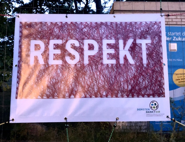 Brigitte Stüwe ist eine vielseitige und anerkannte Dorstener Künstlerin. Ihr aus Baumwollfäden geschaffenes Kunstwerk RESPEKT ist Blickfang und Appell gleichermaßen. Dass es mehrfach zerstört wurde, ist völlig unverständlich. Respekt zu gewähren ist eine wesentliche demokratische Grundlage, die besonders diejenigen im Blick hat, die nicht unbedingt zu den „oberen Zehntausend“ unserer Gesellschaft gehören. Vom Original wurden inzwischen Kopien angefertigt, die über das „Büro für Bürgerengagement“ der Stadtverwaltung erworben werden können. Eine gute Aktion, die flächendeckend für Toleranz, Menschenwürde und Demokratie wirbt. Ein erstes Transparent dieses Kunstwerkes wurde jetzt privat in Rhade, im Kreuzungsbereich Stuvenberg/Kalter Bach/Mainstraße platziert. Als Werbung, als Mahnung, als Motivation, sich für unsere demokratischen Strukturen zu engagieren.
