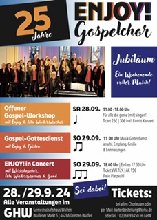 Wer schon einmal ein Konzert des Gospelchors Enjoy besucht hat, geht anders nach Hause, als er oder sie gekommen ist. Es ist nicht nur der mitreißende Gesang, es ist besonders die „Spiel“Freude, mit denen alle Sängerinnen und Sänger die Zuhörer beeindrucken und motivieren, sich auf das Gehörte einzulassen und so plötzlich Teil der Veranstaltung werden. Nun feiert der lokale Chor, mit Wurzeln in Rhade, sein 25jähriges Jubiläum. Enjoy ist nicht mehr wegzudenkender Teil der Dorstener Kulturszene. Kultur macht unser Leben reicher. Wir wünschen dem Initiator und Chorleiter Christian Löer und allen Sängerinnen und Sängern einen erfolgreichen Jubiläumsauftritt. Unsere Anregung an alle Leser lautet: Besucht das Konzert und taucht ein in die besondere Atmosphäre, die der Enjoy-Chor vermittelt.