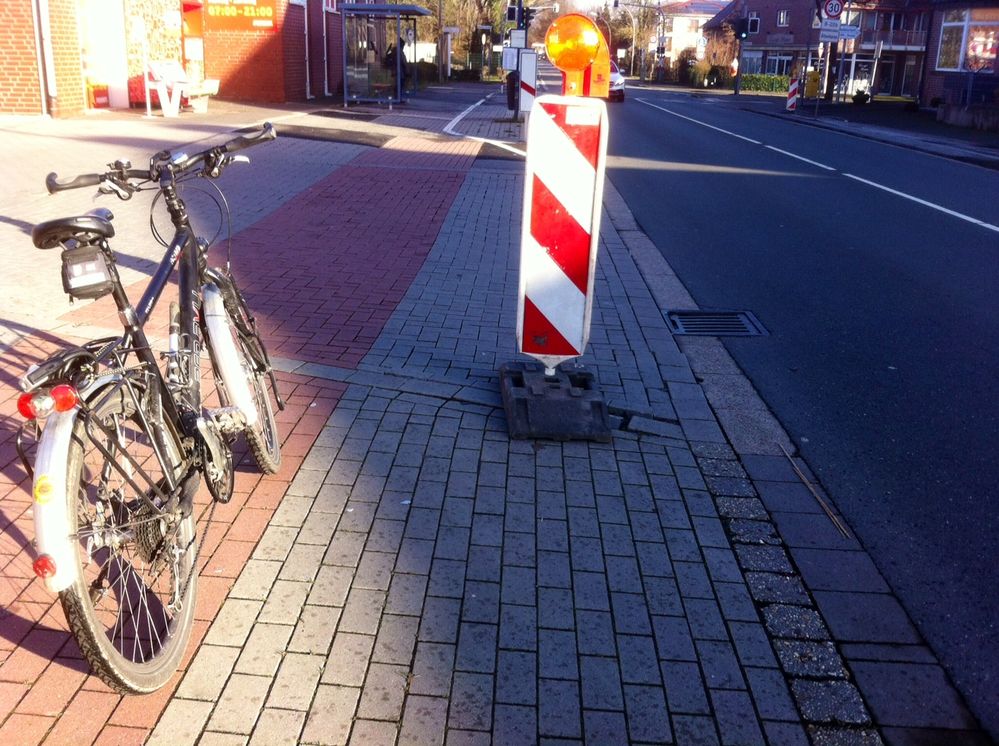 Wie gestern berichtet, ragte aus dem unsachgemäß verlegten Pflaster des Radwegs vor dem Discounter Penny und gegenüber der Apotheke, ein Pflasterstein heraus. Die Verwaltung wurde informiert. Nun die sofortige Antwort. Die Absicherung der beanstandeten Fläche kann aber nur für kurze Zeit die Lösung sein, fordert die Rhader SPD Stadt und Kreis nachdrücklich auf, die Reparatur zügig in Angriff zu nehmen.