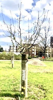 Die gute Nachricht zuerst. Rhade hat sich gemacht. Größer, stärker geworden und aufgeblüht. Die Rede ist aber nicht vom gleichnamigen Dorf im nördlichen Dorsten, sondern von unserem Partnerbaum, den wir im Bürgerpark Maria-Lindenhof, auch bekannt als Stadtkrone-Park, vor einigen Jahren gepflanzt haben. Er soll die Verbundenheit mit der Lippestadt ausdrücken, die Rhade seit 1975 dem Dorstener Zentrum gewährt. Lobend muss auch erwähnt werden, dass nun Rhade richtig geschrieben wurde. Unser mehrfacher Hinweis, dass die stützende Baumsteele den falschen Schriftzug RAHDE zierte, wurde in RHADE geändert. Der Fortschritt ist nun auch optisch sichtbar. Nun steht der jährliche Kontrollbesuch beim Dorsten-Baum in Rhade an. Trägt er Blüten? Ist er gewachsen? Signalisiert der Austrieb eine gute Ernte? Wer im Text auch Symbolik der Dorfentwicklung herausliest, liegt wie immer nicht ganz falsch.