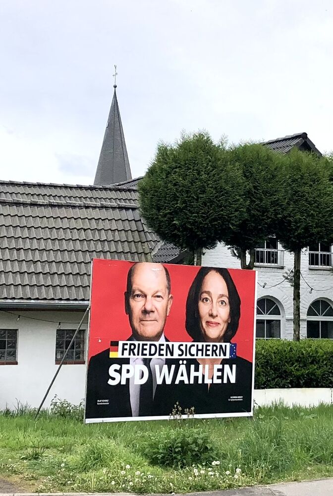 Das in schwarz-rot gehaltene Großplakat zeigt zwei Spitzenpolitiker der deutschen Sozialdemokraten. Sie suchen den direkten Augenkontakt mit dem Betrachter. Ihre Mimik ist nachdenklich, ohne resignativ zu wirken. „Ihr könnt uns vertrauen“, so die mögliche Interpretation. Es handelt sich nämlich um ein Wahlplakat zur Europawahl am 9. Juni, ohne dass das Datum und der Anlass genannt werden. Die beiden Personen, links der Bundeskanzler Olaf Scholz, neben ihm Katarina Barley, werben als prominente Personen dafür, den Frieden zu sichern. So, wie sie es bisher getan haben. Anders erschließt sich die kurze Botschaft nicht. Wer den aktuellen politischen Hintergrund nicht aus den Augen verliert, weiß, dass Olaf Scholz und Katarina Barley höchst verantwortlich alles daran setzen, Deutschland nicht in kriegerische Auseinandersetzungen hineinziehen zu lassen. Zurück zum Bild. Unübersehbar springt der mittig gesetzte Schriftzug SPD WÄHLEN ins Auge. Hier ist deutlich sichtbar, dass der Betrachter, sollte er im wahlberechtigten Alter ab 16 sein, die Partei wählen sollte, die in ihrer 160-jährigen Geschichte bewiesen hat, dass sie Frieden kann. Der rote Hintergrund sorgt für den gewünschten Kontrast und lässt die beiden „Hauptdarsteller“ der plakativen Wahlaussage quasi hervortreten. Sie werben so sehr eindringlich um Unterstützung ihrer Politik. Das Bild, professionell gestaltet, im Rhader Kreuzungsbereich Erler- und Debbingstraße unübersehbar platziert, wird in Erinnerung bleiben.