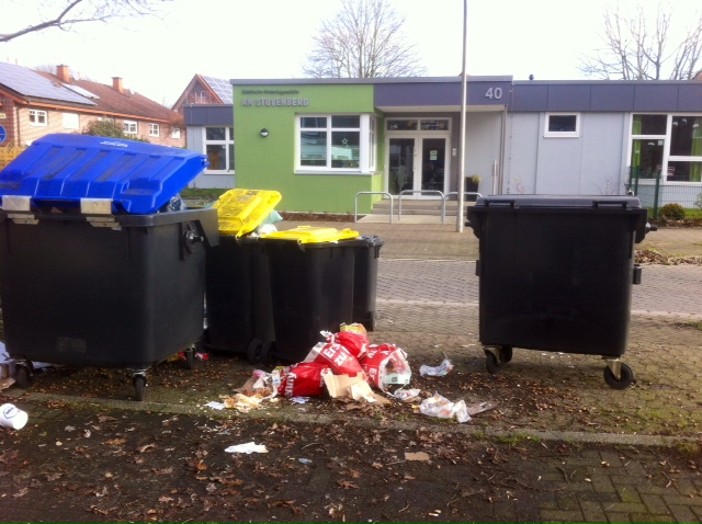 Übervolle, nicht geleerte Mülltonnen sorgten direkt vor dem städtischen Kindergarten in Rhade für Ärger. Weiterer Müll breitete sich drumherum und in der Umgebung aus. Die Rhader SPD nahm nach einem Bürgerhinweis umgehend mit der Verwaltung Kontakt auf. Die Überprüfung löste eine sofortige Leerung und Reinigung vor Ort aus. Hans-Willi Niemeyer bedankt sich auch auf diesem Weg für die „offenen Ohren“ und die Hilfsbereitschaft der Stadtverwaltung.