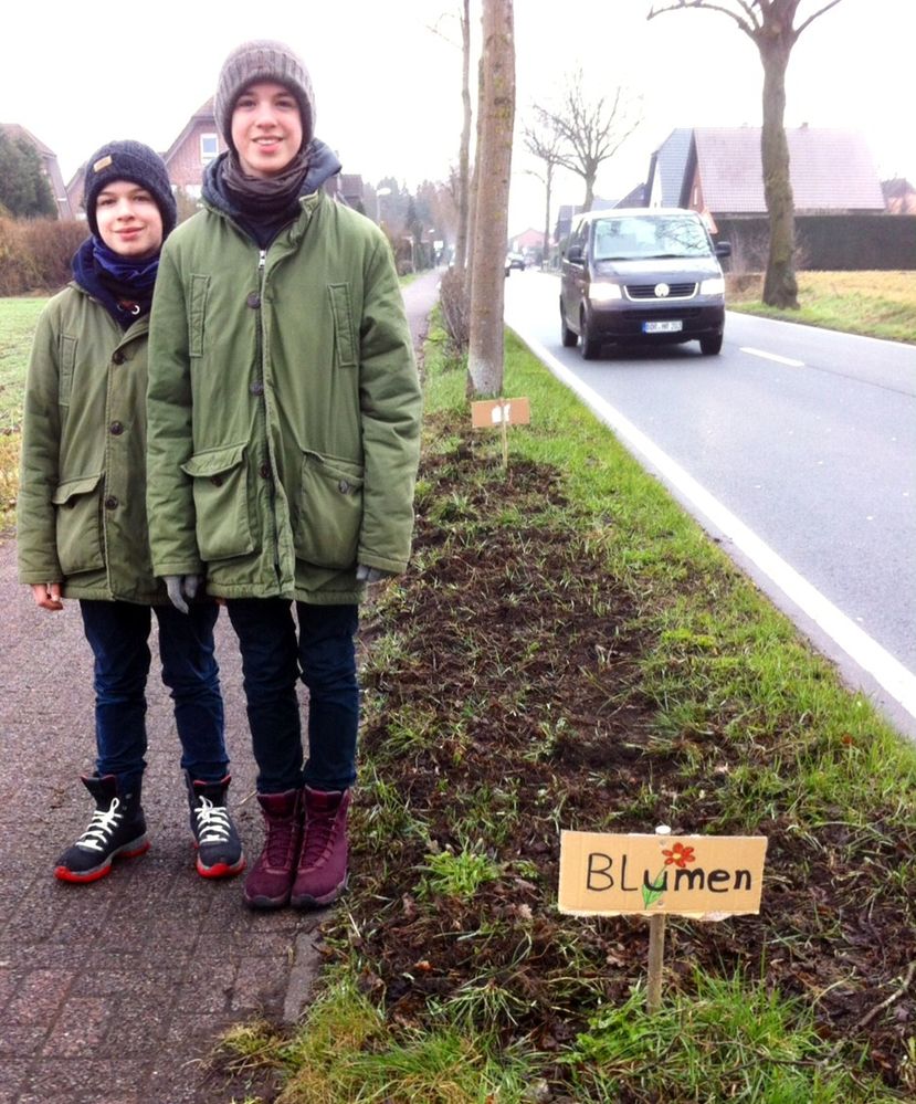 Dass Bienen und Insekten unverzichtbar sind, um das ökologische Gleichgewicht nicht zu gefährden, gehört zum Allgemeinwissen. Trotzdem fehlen Flächen mit blühenden Blumen und Sträuchern, die den genannten Lebewesen Nahrung und Lebensraum bieten, an allen Ecken und Enden. Angeregt durch einen Zeitungsbericht, auch privat Wildblumen auszusäen, griffen 2 Ferienkinder zur Hacke, um ca. 8 Quadratmeter Fläche, den Seitenstreifen an der Lembecker Straße, für die Einsaat vorzubereiten. 2 Schilder mit der Aufschrift „Blumen“ weisen jetzt Autofahrer und andere Verkehrsteilnehmer darauf hin, dieses kleine Areal zu schonen, sprich nicht zu überfahren oder anderweitig zu zerstören. Gespannt werden die beiden Ferienkinder im Sommer nachsehen, ob ihre Aktion erfolgreich war. Zu wünschen wäre es. Außerdem hoffen sie, Nachahmer dieser Aktion motiviert zu haben.