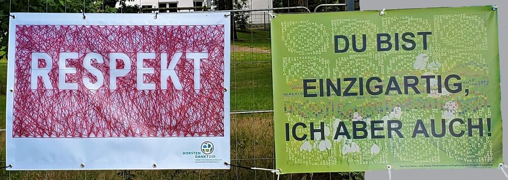 An mehreren Stellen in Dorsten wirbt das RESPEKT-Kunstwerk von Brigitte Stüwe für Toleranz, Menschenwürde und Demokratie; durch eine Privatinitiative seit Mitte Juli nun auch im Kreuzungsbereich Stuvenberg/KalterBach/Mainstraße in Rhade. Ein Bericht darüber erschien am 14. Juli auf dieser Internetseite. Die Reaktion war ausschließlich positiv.