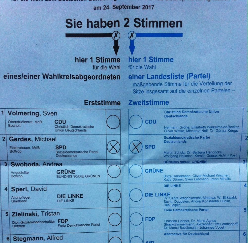 Der Wahltermin am 24. September rückt näher. Wieder Angela Merkel, oder doch eine Zukunftsalternative? Martin Schulz hat einen Plan. Mehr Gerechtigkeit für ALLE! Seine Konkurrentin bevorzugt das „Weiter so“. Wer also Martin Schulz will, muss mit der Zweitstimme SPD wählen. Dann gibt es noch die Erststimme für den Kandidaten in unserem Wahlkreis. Michael Gerdes ist einer von uns. Bodenständig, geradlinig, zuverlässig. Kurz: Wer will, dass unsere Stimme in Berlin Gehör findet, kommt an Michael Gerdes nicht vorbei. Wer nicht am 24. September ins Wahllokal gehen kann, sollte umgehend die Briefwahlunterlagen anfordern. Wie der Wahlschein, nach den Eingangserklärungen ausgefüllt werden sollte, zeigt das Foto.