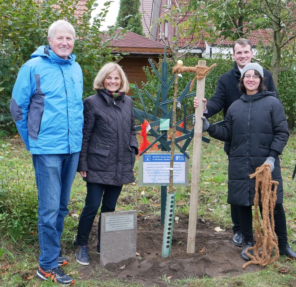 Dass Rhade ein Juwel und ein starkes Stück Dorsten ist, wurde am gestrigen Dienstag eindrucksvoll demonstriert. Zur Rhader Baumpflanzaktion hatte sich, trotz Wind und Wetters, eine Gruppe Bürgerinnen und Bürger eingefunden, um mit einem nachhaltigen Symbol die Verbundenheit Rhades mit der Lippestadt zu demonstrieren. Ein Baum mit dem Namen „Dorsten“ wird viele Jahre daran erinnern, dass die Flächenstadt aus Mosaiksteinen, sprich Stadtteilen, besteht. Sein Gegenstück trägt den Namen „Rhade“ und wird im Bürgerpark Maria Lindenhof Wurzeln schlagen. Wilhelm Loick, Sprecher des Rhader Bürgerforums, konnte zur Pflanzaktion auch den Bürgermeister Tobias Stockhoff und Marion Taube, begrüßen, die den Dorstener Bürgerpark, zwischen Lippe und Kanal gelegen, mit vielen Aktionen „wach geküsst“ hat. Eine Idee dazu wurde in Rhade geboren. Brigitte Hartwich knüpfte den „Roten Faden“ mit einem Sternlauf zum Bürgerpark, der von allen 11 Dorstener Stadtteilen übernommen wurde.