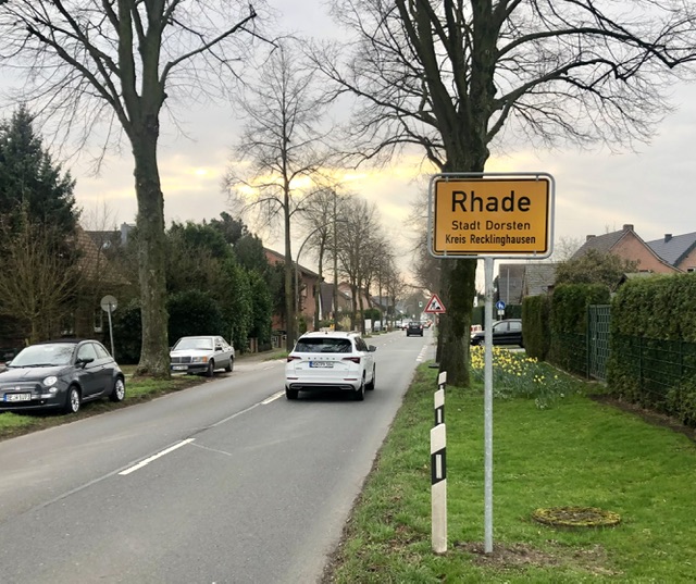 Am 30. und 31 Januar machten wir an dieser Stelle öffentlich, dass das Ortseingangsschild RHADE, von Lembeck kommend, nicht mehr vorhanden ist. Gemerkt hat es kaum einer. Auch die Verwaltung zeigte sich überrascht. Aber sie hat den Hinweis umgehend aufgegriffen und um ein neues Schild beim Tiefbauamt des Kreises RE gebeten. Nach 5 Wochen signalisiert das gelbe Schild mit dem Schriftzug, „Rhade - Stadt Dorsten - Kreis Recklinghausen“, Foto, in eine geschlossene Ortschaft zu fahren und parallel vom Gaspedal zu gehen. Das ist insofern wichtig und ein entscheidender Aspekt der Sicherheit, weil die Kreisstraße nun 3 Kilometer fast schnurgerade durch bewohntes Gebiet führt. Sie trägt den Namen Lembecker- und Erler Straße und ist seit vielen Jahren Stein des Anstoßes. Fehlendes Begleitgrün, zu hohe Geschwindigkeiten, Radwege, die mehrfach die Straßenseite wechseln, dabei teils in unzumutbarem Zustand sind, sowie in Teilbereichen ungeordnetes Parken, rufen nach grundlegender Verbesserung. Ob der Ruf über die Dorstener Verwaltung auch im zuständigen Kreishaus Recklinghausen gehört wird, ist mehr als eine Hoffnung. Wir sagen, es ist eine Pflichtaufgabe!
