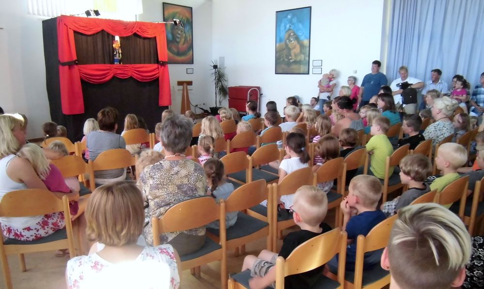 Dass das Carola Martius-Haus wieder bis auf den letzten Platz belegt war, gehört zu den positiven Erfahrungen der Organisatoren des Ferienspaßes in Rhade. Ein Blick in die glänzenden Kinderaugen mit den geröteten Wangen reicht aus, um dem Hohnsteiner Theater mit Stefan Tränkler zu bescheinigen, einen Volltreffer gelandet zu haben. Die Geschichte mit dem Kasper, Seppel, der Großmutter, dem Polizisten und natürlich dem Räuber Hotzenplotz ist schnell erzählt. Mit Hilfe der Kinder konnte der Kasper den Räuber finden und überführen. Lautstark erkannten die kleinen Besucher sofort wer das Gute und das Böse verkörpert. Es ist nicht nur die Geschichte, sondern in erster Linie "großes Theater", wenn der Puppenspieler über 100 Kinder 50 Minuten zum konzentrierten Zusehen und Mitspielen motivieren kann. Der Applaus zum Schluss, die vielen positiven Kommentare begleitender Eltern und Großeltern zeigten der Organisatorin Brigitte Hartwich, wieder das richtige Stück und eines der besten und ältesten Puppentheater Deutschlands eingeladen zu haben. 1928 gegründet, übrigens als Figurentheater für Erwachsene, wurde es in den 40er Jahren von den Nazis wegen politisch missliebiger Texte des Kaspers und seiner Freunde zwangsweise aufgelöst, um nach 1950 mit neuem Schwung auf die Bühne zurückzukehren. Stefan Tränkler spielt seit 25 Jahren mit den Original Hohnsteiner "Holzköpfen". In Rhade war er bereits zum 3. Mal. Sein Urteil: Ein tolles Publikum, eine hervorragende Organisation, eine passende Spielstätte, kurz, ein Auftritt, der nicht nur den kleinen und großen Kindern vor der Bühne, sondern den Akteuren dahinter viel Spaß gemacht hat. Möglich war dieses Kulturangebot für alle, durch das großzügige Sponsoring der örtlichen Volksbank, der kath. Urbanus-Gemeinde, die das Carlola Martius-Haus zur Verfügung gestellt hat, Achim Schrecklein, der Handzettel und Plakate beigesteuert hat und viele Helfer der Rhader SPD. Auf ein Neues 2017? "Ja", so die Organisatorin, "wenn alle wieder mitmachen, sollte es möglich sein, auch im nächsten Jahr einen Ferienspaß-Beitrag dieser Größenordnung anzubieten".