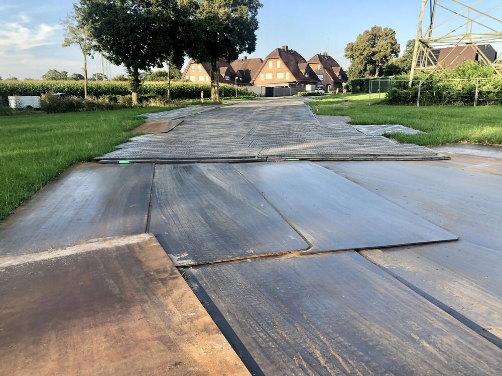 Die Dimensionen sind gewaltig. Windkraftwerke, die früher mal Windmühlen hießen, werden immer riesiger und leistungsstärker. Spezialtransporter können nicht nur nachts in verkehrsarmer Zeit verkehren, sondern benötigen zum Rangieren Flächen, die die vorhandenen Straßen nicht hergeben. Bäume müssen gefällt, Laternen und Ampelanlagen abgebaut, sowie neue provisorische Straßen mit riesigen Stahlplatten ausgelegt werden. Nur so sind die Engpässe in Rhade im Bereich der Kreuzung Stuvenberg/Rütherweg zu überwinden. Das Foto zeigt die neue „Stahlstraße“ zwischen Lembecker Straße und Rütherweg, die aber nur eine begrenzte Lebensdauer hat. Künftig wird in unserer Region dringend benötigte Energie mit den neuesten Windkraftanlagen produziert. Die dafür notwendigen Eingriffe in den Naturhaushalt werden komplett ausgeglichen. Nur durch konsequentes nachhaltiges Wirtschaften in allen (Lebens)Bereichen, sichern wir unsere Zukunft. Rhade ist ein kleiner, aber wichtiger Mosaikstein des Ganzen.