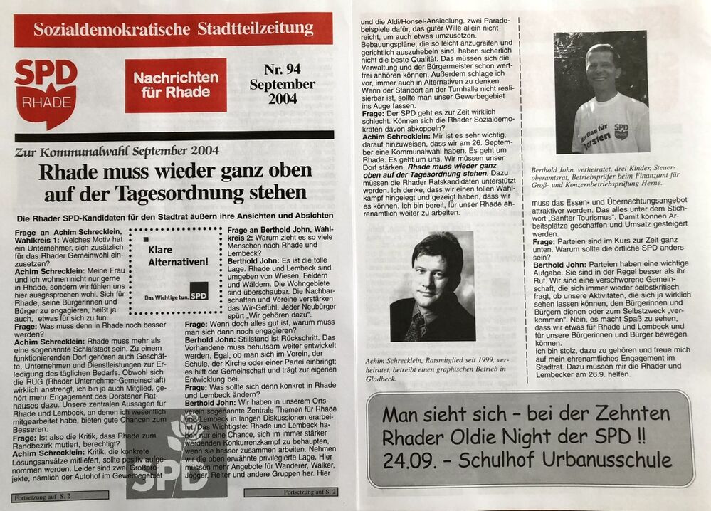 Die Rhader SPD, erst seit 35 Jahren auf der kommunalpolitischen Bühne aktiv, hat bereits wichtige Zeichen gesetzt und ist weiter dabei, die parteipolitische Konkurrenz im Ort herauszufordern. Die Wahlergebnisse verbessern sich kontinuierlich, allseitiger Respekt gegenüber den aktiven Sozis wird offen ausgesprochen. Zur Kommunalwahl im September 2004, sind es Achim Schrecklein im Wahlkreis 1 und Berthold John im Wahlkreis 2, die im Interview mit der Stadtteilzeitung „SPD-Nachrichten für Rhade“ mit guten Argumenten (siehe Foto) für sich und Rhade werben. Nach Auszählung der Stimmen, konnte sich Achim Schrecklein weiter Ratsherr für Dorsten nennen. Berthold John vertrat die Rhader SPD dagegen in wichtigen Ausschüssen als sachkundiger Bürger. Beide haben es geschafft, dass Rhader Themen in den folgenden Jahren ganz oben auf der Tagesordnung standen.