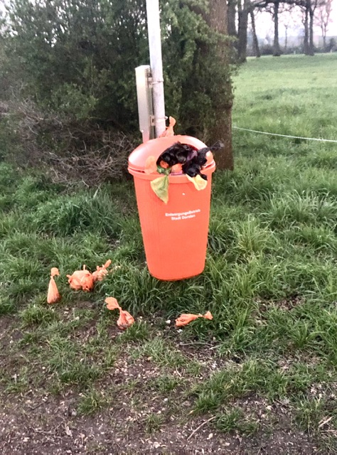 Wer ist noch nicht in einen Haufen Hundekot, der illegal auf dem Gehweg hinterlassen wurde, getreten? Wer hat sich noch nicht danach über die Säuberung seiner erbärmlich stinkenden Schuhe geärgert? Na bitte. Keiner der Leser dieser Zeilen. Es ist einfach nicht in die Köpfe einiger Hundehalter reinzukriegen, dass sie allein verantwortlich sind, die stinkende Hinterlassenschaft ihres vierbeinigen Freundes vorschriftsmäßig zu entsorgen. Er, der Hund, pardon, natürlich auch die Hündin, sind nicht in der Lage direkt in einen Beutel zu koten und ihn in aufgestellte städtische Behälter zu werfen. Das Ordnungsamt versucht alles, um die Hundehalter artgerecht zu erziehen. Das klappt überwiegend. Wer aber aktuell den roten „Hundekacke-Abfallbehälter“ im Kreuzungsbereich Debbingstraße/Ringstraße/Zum Vorwerk in Augenschein nimmt, muss (ver)zweifeln. Weil der Behälter voll ist, werden weitere Beutel nicht mitgenommen, sondern auf dem Boden davor abgelegt. Wem muten diese Zeitgenossen eigentlich zu, diese aufzuheben? Der Müllabfuhr? Ist es wirklich zuviel verlangt, über die Folgen des eigenen Handelns nachzudenken? Die Liedzeile, "Die Antwort mein Freund, weiß ganz allein der Wind“, passt hier gar nicht.