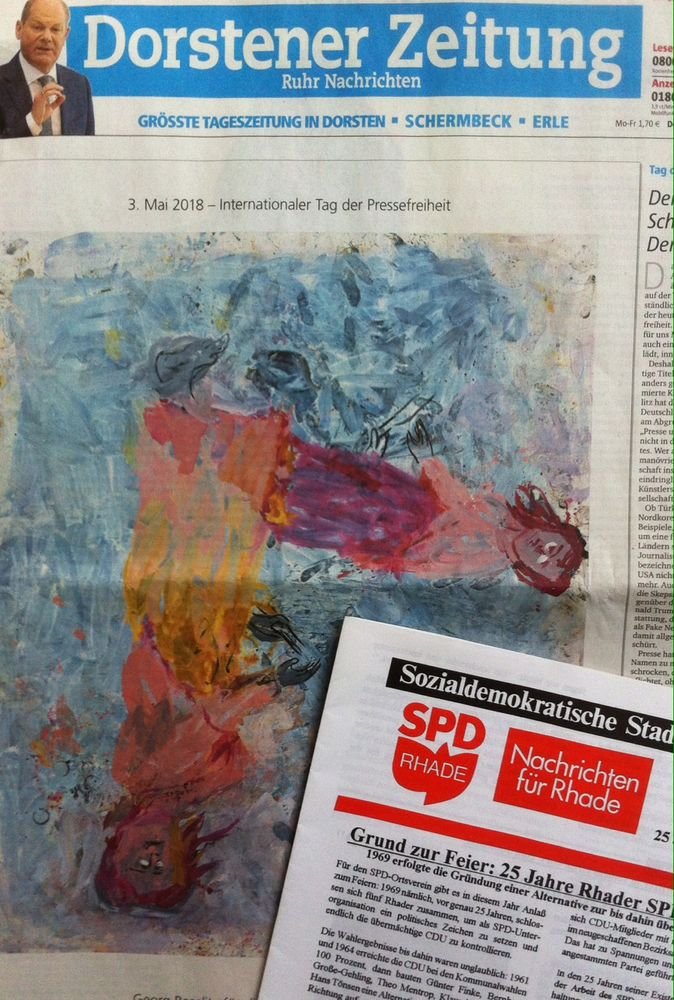 Gestern überraschte die Dorstener Zeitung mit einer ungewöhnlichen Titelseite. Mit einem Bild des Künstlers Georg Baselitz wurde an den Tag der Internationalen Pressefreiheit erinnert. Die Rhader SPD, die selbst täglich auf der Internetseite www.spd-rhade.de überwiegend eigene Beiträge öffentlich einstellt und in unregelmäßigen Abständen die Zeitung „SPD-Nachrichten für Rhade“ produziert, unterstützt alle Bemühungen, frei, kritisch, und nachfragend zu berichten. Trotz Facebook, Twitter und Co. – eine unabhängige Tageszeitung ist nach wie vor das Beste am Morgen.
