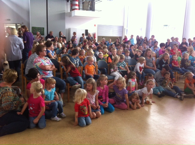 Die Stühle reichten nicht, alle am Rand stehenden Tische waren besetzt, Kinder saßen auf dem Boden vor der Bühne und hinten mussten Erwachsene mit einem Stehplatz vorlieb nehmen. „Mehr geht nicht“, so die stolze Organisatorin Brigitte Hartwich, die mit Hilfe von Sponsoren und Helfern eines der renommiertesten deutschen Puppentheater nach Rhade verpflichtet hatte: Das Original Hohnsteiner Puppentheater.