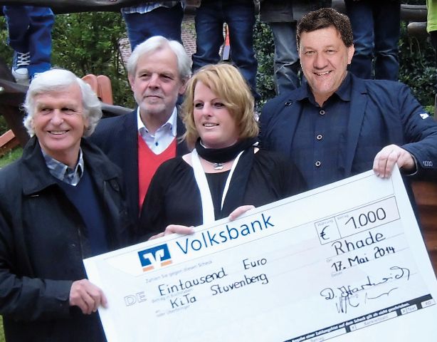 Mit der stolzen Summe von 1.000 Euro, die die 3 engagierten Rhader aufbrachten, konnte eine wichtige Finanzlücke des Fördervereins geschlossen werden, um eine so genannte Matsch-Ecke für die Kleinen errichten zu können.