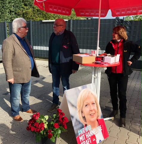 Samstagmorgen in Rhade. Auf dem Weg zum Bäcker fallen neue, kreative Plakate der SPD ins Auge. „Ihr lasst euch wirklich was einfallen“, so anerkennend der häufig geäußerte Kommentar an den 2 Informationsständen der Sozialdemokraten, die unweit der beiden Bäckergeschäfte aufgebaut wurden. Viele SPD-Helfer überreichen Rosen, suchen das Gespräch und bitten um die Teilnahme an der Wahl. Mittendrin Hans-Peter Müller, der rührige SPD-Kandidat und „amtierender“ Landtagsabgeordneter. „Wir wollen, dass in Rhade Hannelore Kraft und die SPD noch besser als bei den letzten Landtagswahlen abschneiden. Der eingeschlagene Weg, sich für mehr Chancengleichheit unserer Kinder, für Gebührenfreiheit aller Bildungswege und für mehr Gerechtigkeit einzusetzen, verdient absolute Unterstützung“, so Christoph Kopp, Vorsitzender der Rhader Sozialdemokraten.