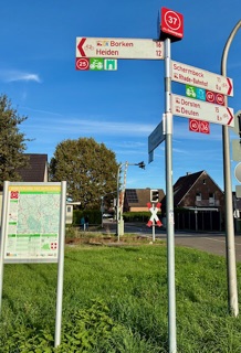 Die Idee wurde 2017 in Rhade geboren. Ein Arbeitskreis des hiesigen Bürgerforums regte an, die durch Rhade verlaufenden überregionalen Fernradwege „100-Schlösser-Route“ und „Hohe Mark-Route“ mit der durch Dorsten führenden „Römer-Lippe-Route“ zu verbinden. Die Strecke mit der Bezeichnung „Rhader Radspange“ wurde mehrfach abgefahren und dokumentiert, bis der Verwaltung ein erster Entwurf vorgestellt werden konnte. Diese zeigte sich sehr interessiert und begleitete das Rhader Bürgerprojekt im Zusammenwirken mit dem Naturpark Hohe Mark fortan konstruktiv. Dennoch sollte es noch 8 Jahre dauern, bis die ca. 12 Kilometer lange Strecke endgültig festgelegt und beschildert wurde. Sie fasziniert durch ihren verkehrssicheren Verlauf, führt durch attraktive Wald- und Wiesengebiete und streift attraktive Besichtigungspunkte. Steigen wir im Rhader Kreuzungsbereich Schlehenweg/Feldstraße aufs Rad (Knotenpunkt 37) und folgen den Schildern in Richtung Süden. Unübersehbar ist auch das Rhader Wappen, der in diesem Fall blaue Baumstumpf, unser ständiger Begleiter. Die überwiegend asphaltierte Strecke führt durch das Rhader Wiesengelände, den Wald am Deutener Moor, quert Deuten, streift das Muna-Gelände, erreicht Hervest (Knotenpunkt 45) grüßt den Fürst-Leopold-Förderturm und folgt dem Verlauf der aufgegebenen Zechenbahnlinie, um direkt an der Lippe (Knotenpunkt 67) sowie des angesteuerten Fernradwegs „Römer-Lippe“ zu enden. Wenn beim Start in Rhade und an der Lippe noch Infotafeln stünden, die die Radler auf Übernachtungs- und Gastronomieangebote hinwiesen, wäre die Rhader Radspange ein komplettes Tourismus-Highlight für die Lippestadt. Die Anregung an die Leser lautet: „Rauf aufs Rad, um das Beschriebene zu erleben.“