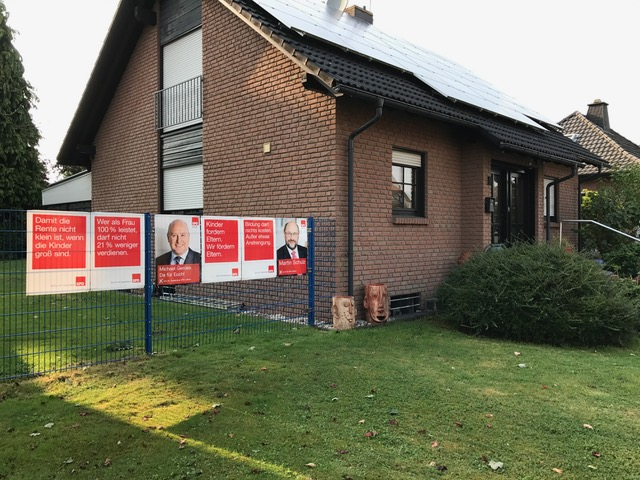 Die besseren Argumente überzeugen. Plakate haben aber eine wichtige ergänzende Funktion. Sie machen aufmerksam. Aufmerksam, auf eine wichtige Bundestagswahl am 24. September. Und in Rhade wird geworben. Nicht nur mit Plakaten, sondern mit vielen Gesprächen. Von Nachbar zu Nachbar, von Sportfreund zu Sportfreund, in der Familie, kurz: überall. Wenn dann am 24. September ausgezählt wird, werden diejenigen vorne sein, die mit Plakaten auf die Wahl und sich aufmerksam gemacht und mit besseren Argumenten überzeugt haben. Dass das nur Martin Schulz, Michael Gerdes und die SPD sein können, daran haben die Rhader Sozialdemokraten keinen Zweifel.