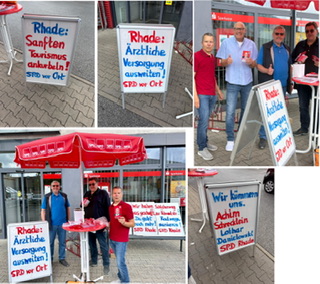 Freitagmittag, 12 Uhr. Das Rhader Einkaufszentrum ist gut besucht. Das Wochenende steht vor der Tür. Eine gute Gelegenheit sich zu präsentieren. Die örtlichen Sozialdemokraten bauen ihren Infostand auf. Unübersehbar leuchtet der rote Sonnenschirm mit dem SPD-Schriftzug. Achim Schrecklein und Lothar Danielowski, die Ratskandidaten sind gut gelaunt und hoch motiviert. Sie gehen auf die Bürger zu, überreichen kleine Aufmerksamkeiten und versuchen Gespräche über die bevorstehende Kommunalwahl zu führen. Dabei werden sie von Berthold John und Ulrich Zagberg bestens unterstützt. Das Besondere des Infostands sind diesmal selbst beschriftete Plakate, die kurz und knapp aussagen, was in Rhade angepackt werden muß. Das sorgt für Aufmerksamkeit und Nachfragen. Und genau das ist das Ziel der Rhader Sozialdemokraten, zuzuhören, die eigene Vorstellung von lebendiger Kommunalpolitik einzubringen und um Unterstützung am 14. September zu bitten. Achim Schrecklein und Lothar Danielowski zeigen sich hochzufrieden, wieder ganz nah bei den Rhadern gewesen zu sein. Fortsetzung folgt, so beide auf Nachfrage.