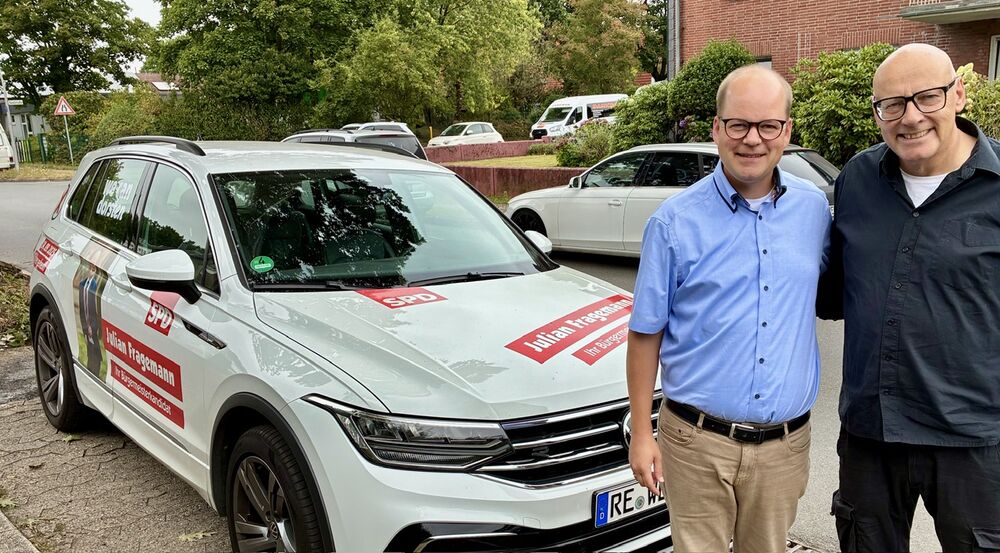 Sonntag. Ein auffällig beschriftetes Fahrzeug parkt in Rhade. Julian Fragemann ist da. Unübersehbar sein Name mit dem Zusatz „Ihr Bürgermeisterkandidat“ und dem SPD-Logo. Julian Fragemann will sich den Rhadern persönlich vorstellen. Unterstützt von Lothar Danielowski, dem örtlichen Stadtratskandidaten, kommen sie bei ihrem Haustürbesuch mit vielen Bürgerinnen und Bürgern ins Gespräch. Beeindruckt zeigen sie sich von der Aufgeschlossenheit und Freundlichkeit der so kontaktierten Rhader Einwohner. Noch 5 Wochen bis zur Kommunalwahl. Julian Fragemann wird diese Zeit nutzen, um mit den sozialdemokratischen Kandidatinnen und Kandidaten überall in Dorsten den Haustürbesuch fortzusetzen. Wer das weiße Auto mit der roten SPD-Beschriftung sieht, kann Julian Fragemann direkt kontaktieren und ihn mit Fragen löchern. Gelingt das nicht, freut er sich über jede andere Kontaktaufnahme. Sein Versprechen: Ich melde mich ohne Zeitverzug umgehend.