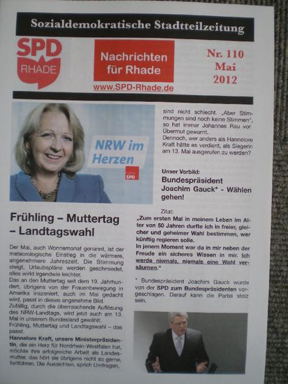 Mit der 110. Ausgabe der „SPD-Nachrichten für Rhade, einer Stadtteilzeitung der örtlichen Sozialdemokraten, wird auf die bevorstehende Landtagswahl mit ausschließlich eigenen Berichten hingewiesen und für eine hohe Wahlbeteiligung geworben.