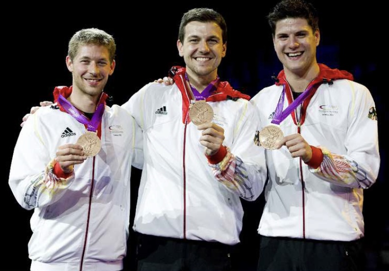 Fotohinweis: Die Krönung großer Karrieren: v. l. n. r: Bastian Steger, Timo Boll und Dima Ovtcharov mit Olympia-Bronze 2012. Foto vom SSV-Rhade zur Verfügung gestellt.