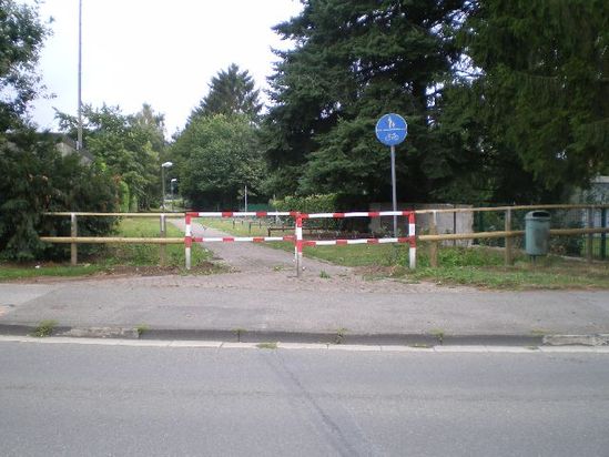 Die rotweiße Hindernisbarriere soll Radfahrer (Schulkinder) auf dem Geh- und Radweg entlang der Schule/Turnhalle daran hindern, ungebremst auf die Durchfahrtsstraße (Erler Straße) zu gelangen.